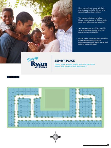 In search of an affordable, CDD-free, family-friendly community in a fast growing area with easy access to Tampa? See why everyone is talking about Zephyr Place! Our community of 130 homes offers homebuyers one and two story homes perfect for growing families, or those looking for main floor living – we have it all. Choose from four floorplans, up to 1,895 sq. ft. with modern, open layouts perfect for entertaining. Make your new home your own with our professionally-designed interior palettes – it’s easy to personalize your space. We are zoned for USDA 100% financing, so you don’t have to worry about any hidden costs or additional out-of-the-pocket expenses. We are a NO CDD community with a low HOA fee, and cable TV and high-speed internet are included, too! Here at Zephyr Place, you can own a brand new home for a truly affordable monthly payment!Schedule and appointment for more information on pricing, floorplans and incentives.