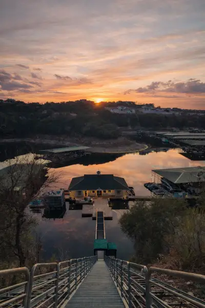 Scenic Highland Lakes reservoir west of Austin, known for boating, cliffside views, and upscale lakefront living.