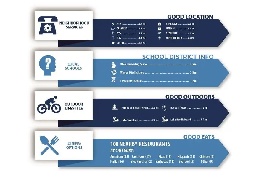 Great neighborhood with oversized lots, swimming pool with an amenities center and playground! Walking distance to the highly acclaimed elementary and high school and Forney's 127 acre park! Located right off HWY 80 and 4 miles from HWY 20, The Villages of Fox Hollow is only 25 minutes from downtown Dallas. Country living with city amenities!