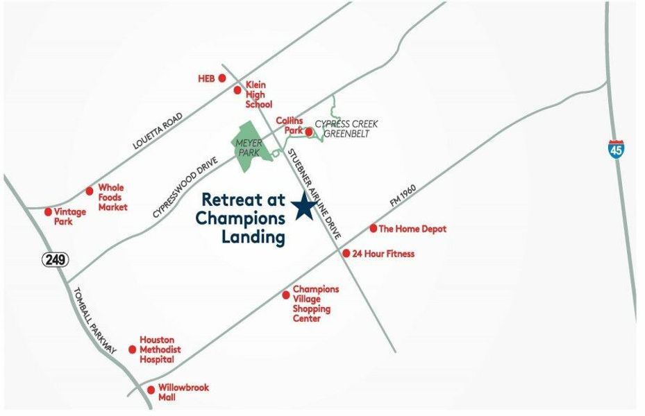 Retreat at Champions Landing is in a highly sought-after location in the acclaimed Klein Independent School District. Enjoy a playground and green space within the community, or venture nearby to Meyer Park with a walking trail, fishing lake, sports fields, and more. Featuring new home construction with flexible living spaces, Retreat at Champions Landing is the perfect place to build your new Centex home.