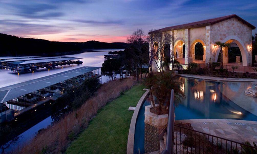 Scenic Highland Lakes reservoir west of Austin, known for boating, cliffside views, and upscale lakefront living.