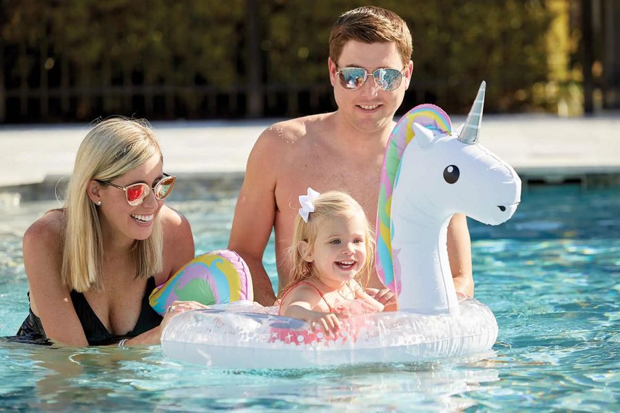 The outdoor pool is “SPLASH” worthy to say the least! The Swimmin’ Hole is a Jr. Olympic pool with a kids splash zone, adult lounging area, covered patio, and a pergola with shade.