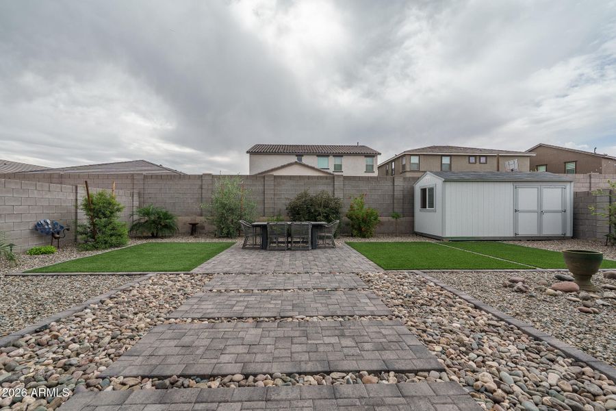This beautifully maintained, original-owner home blends generous space with thoughtful design, offering 4 bedrooms plus a versatile den/office and 3.5 baths across 2,757 SqFt. The main floor features an open great room that flows effortlessly into an upstairs loft, creating multiple areas for relaxation and gathering. A stunning kitchen anchors the heart of the home with white shaker cabinetry topped with crown molding, quartz countertops, a chevron-pattern subway tile backsplash, stainless Samsung appliances, a walk-in pantry, and an island with breakfast bar and pendant lighting. Sliding doors extend the living space to a covered patio and a fully landscaped backyard complete with paver steps, an additional paver patio, artificial turf, low-voltage lighting, and a 12x16 storage shed. All bedrooms are located upstairs, including a spacious primary suite with a dual-sink vanity, separate tub and shower, and a walk-in closet. A secondary bedroom with its own en-suite bath offers an ideal setup for guests. Additional highlights include a convenient drop-zone with cabinetry, a tankless water heater, designer light fixtures, understairs storage, and a 3-car tandem garage with epoxy flooring and a service door to the backyard.