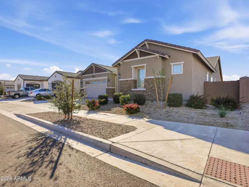 Welcome to this thoughtfully designed home offering generous living space and a highly functional split floor plan. Upon entry, a versatile game room is flanked by two secondary bedrooms and a full bathroom, ideal for guests, work, or play. The private primary suite features dual walk-in closets, a spa-inspired bathroom, and convenient access to the laundry room, while an additional secondary bedroom and bathroom are located down the hall. The heart of the home showcases an open-concept great room that seamlessly connects the chef's kitchen and dining area and opens to a covered patio for effortless indoor-outdoor living. Designer Platinum upgrades include quartz countertops, Sonoma Maple Linen (white) cabinetry, and stylish 7x22 plank tile flooring throughout the main living areas. Outside, the home continues to impress with an extended concrete pathway leading to the front yard, a widened driveway with additional concrete on both sides of the home, and three extra slab parking spaces in front. The backyard is designed for both relaxation and entertaining, featuring turf and pavers, a gazebo with full outdoor furniture, a gas fireplace, and a built-in two-burner setupall conveying with the property. Washer and dryer are also included, making this home truly move-in ready.