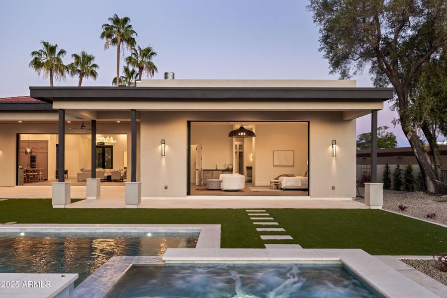 Welcome to an extraordinary luxury NEW BUILD where refined elegance meets effortless modern living. Located in guard gated Pinnacle Peak Country Club Estates alongside a fairway of the community's private golf course, this custom-designed 5300 sqft single level residence presents a rare fusion of architectural sophistication, top-tier craftsmanship & seamless indoor/outdoor living. Soaring ceilings, sun-drenched interiors & an open-concept layout curated for both entertaining & everyday comfort welcomes residents & guests. A dramatic linear fireplace flanked by custom built-ins & an oversized disappearing wall of glass opens to resort-caliber outdoor living - effortlessly blurring the line between inside & out. The heart of the home is a chef's dream kitchen featuring premium [MORE] The heart of the home is a chef's dream kitchen featuring premium stainless appliances, sleek quartzite counters, custom cabinetry & pass-through bar window. A generous center island with seating doubles as a prep space & social hub, ideal for casual mornings or hosting elegant evenings. Designer lighting, wide-plank European oak wood floors & natural textures add depth & warmth to the minimalist aesthetic, creating an ambiance that is both inviting & timeless. With an emphasis on both comfort & functionality, the open floor plan includes a casita with separate entrance, all ensuite guest bedrooms & a luxurious oversized primary suite that redefines relaxation with a private linear fireplace & peaceful views. Executed with impeccable finishes & thoughtful design, the suite features custom double walk-in closets, private laundry with washer & dryer, steamer closet, oversized disappearing glass wall with direct patio access, a spa-inspired bathroom with freestanding soaking tub, walk-in shower & more. Beyond the interior the backyard is a masterpiece by itself, showcasing a sparkling new heated Pebbletec pool with integrated spa, luxury limestone decking, pristine turf accents, custom outdoor kitchen with Green Egg smoker, refrigerator & grill & multiple lounging areas - truly crafted for year-round enjoyment under the Arizona sun & stars. Located just minutes from upscale shopping, dining & golf yet nestled in a quiet community that feels like a private retreat, this residence captures the very essence of Arizona living where luxury, lifestyle & location converge. This is a rare opportunity to own a brand new move-in ready masterpiece designed for the discerning buyer who demands the best in form, function & finish.