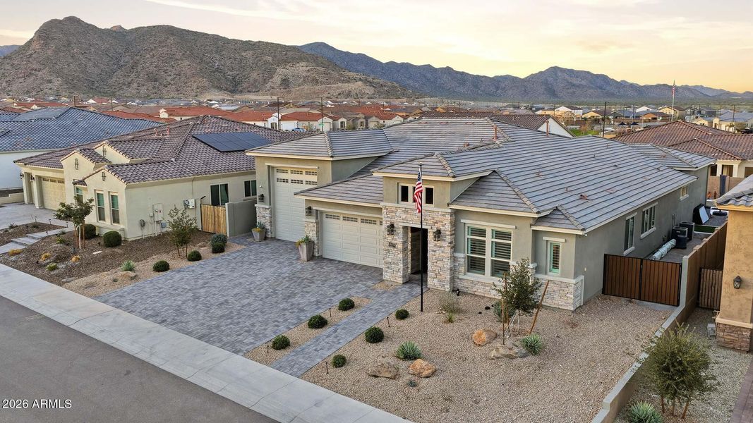 Impeccably upgraded David Weekley home featuring an RV garage and a resort-style backyard, thoughtfully designed and meticulously maintained to reflect true pride of ownership. The heart of the home is the gourmet kitchen, showcasing a stunning waterfall-edge island, professional-grade Monogram appliances, double wall ovens, pot filler, and a built-in Thermador wine refrigerator, ideal for both everyday living and entertaining. The luxurious primary suite offers soaring 12-foot ceilings, an expansive walk-in shower with multi-shower heads including rain head, and an oversized walk-in closet, creating a serene private retreat. Wood-look tile in an elegant herringbone pattern flows throughout the home, adding warmth and timeless style. Additional living spaces include a private guest suite with ensuite bath and kitchenette, two secondary bedrooms connected by a Jack-and-Jill bathroom, and a dedicated office or den. The oversized three-car tandem garage and impressive 50-foot RV garage with epoxy floors are true standout features, offering exceptional storage and flexibility. Outdoor living is elevated with a sunken fire pit, above-ground spa, custom cantilever shade structure, travertine hardscape, and permanent holiday lighting - perfect for year-round enjoyment. Schedule your private tour today and discover the best Canyon Views has to offer.