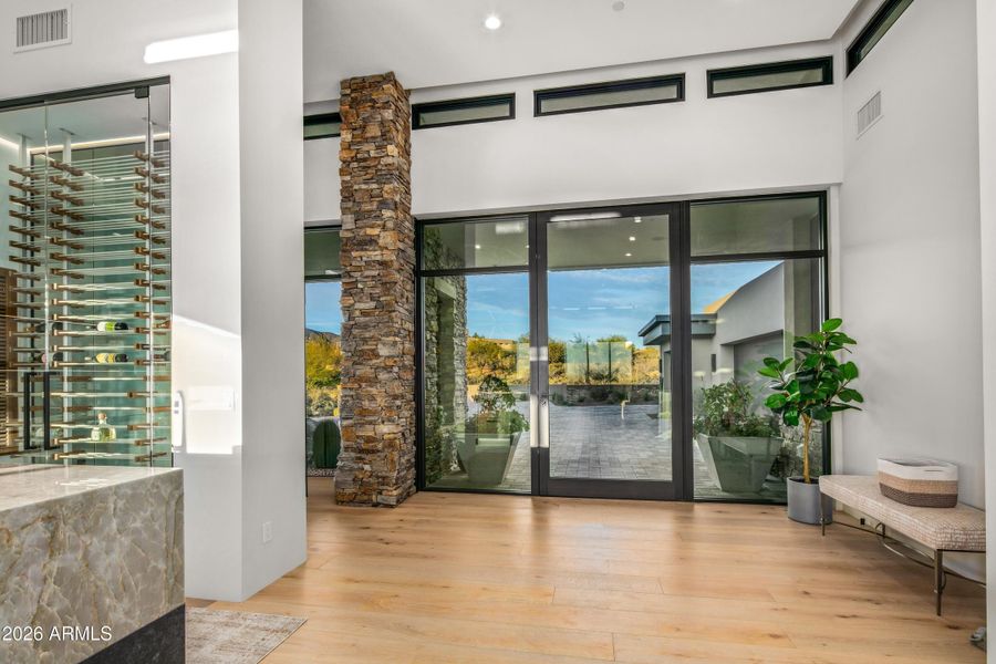Golf Membership Available- Experience refined desert living in this brand new, elevated, exquisitely crafted residence located in Desert Mountain's prestigious Village of Rose Quartz. From its inception, this home was envisioned and executed without compromise. Designed by renowned architect Scott Lenz and masterfully constructed by Geist Builders, every element reflects intentional design, superior craftsmanship, and enduring quality. Thoughtfully elevated yet seamlessly integrated into the natural desert landscape, the residence offers true single-level living both indoors and out. Upon arrival, a dramatic glass entry door sets the tone—sophisticated, inviting, and instantly calming. Walls of retractable glass dissolve the boundaries between inside and out, unveiling sweeping mountain , desert, and twinkling city-light views that define the essence of Arizona living. The floor plan is impeccably executed with a desirable split design. The private Primary Retreat is peacefully separated from the main living areas, while two luxurious guest ensuites occupy the opposite wing, providing comfort and privacy for all. A 4th bedroom ensuite or office is located on another end of the home for an additional private retreat. The open-concept living spaces are ideal for both entertaining and everyday enjoyment. At the heart of the home is a showstopping Chef's kitchen featuring an expansive island with seating for five, exquisite stone surfaces, top-tier appliances, and a conveniently located walk-in pantry. Adjacent gathering areas encourage connection, while the striking wet barwith its floor-to-ceiling, temperature-controlled glass wine roommakes an unforgettable statement visible from the moment you enter. A sleek, floor-to-ceiling linear fireplace and mounted television create a warm, modern backdrop for relaxed evenings or lively conversation. Outdoor living is nothing short of extraordinary. The L-shaped pool with Baja entry, spa with cascading water feature, covered patio for lounging, and built-in grill for alfresco dining offer a resort-style experience at home. A putting green adds playful charm, while the fire pit provides the perfect setting to savor Arizona's legendary sunsets as the sky transforms in brilliant hues.Exceptional features include spray foam insulation, an air-conditioned garage, and tankless water heatersjust a glimpse of the many high-performance enhancements throughout. This brand new residence has been impeccably maintained and can be purchased furnished with curated Restoration Hardware pieces, enhancing its turnkey appeal. Ideally situated within Rose Quartz, the home enjoys elevated vistas and convenient access to Desert Mountain's world-class amenities. For those seeking an exceptional lifestyle defined by luxury, comfort, and natural beauty, this remarkable property invites you to embrace the very best of desert living.