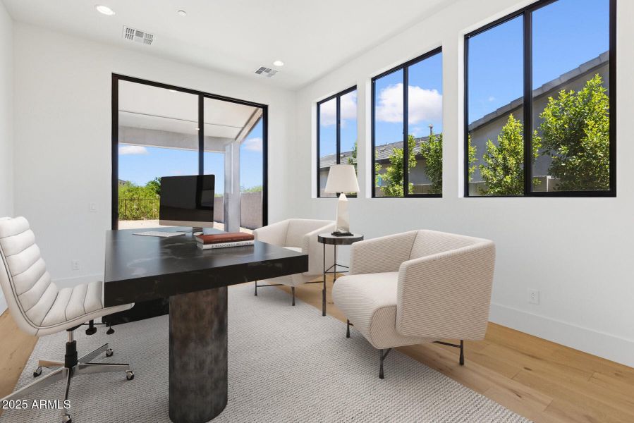 Large energy efficient windows throughout; stacking glass doors at study, familyroom and dining PLUS 90 degree dual sliding doors at family room; 3 bed, 3.5 bath + enclosed study; fireplace at family room; tiled showers in both ensuites; Wolf appliances, exposed beams at owner's retreat; waterfall island w/custom tile and cabinets; added electrical thruout; wood flooring; custom closet system in owner's retreat; upgraded paint and molding, 2x6 construction and much more; EXTENSIVE NEW HOME WARRANTY.