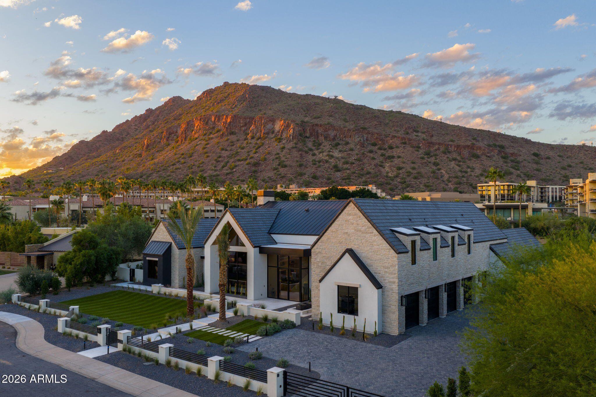 This privately gated custom estate, ideally located between Arcadia Proper and Paradise Valley in the prestigious Hopi School District, blends modern design with resort-style amenities. Inside, an impressive kitchen with a full back kitchen and pantry anchors the home, complemented by five en-suite bedrooms, a guest suite, office, fitness room, and pool house—balancing elegance with function. Outdoors, a sparkling oversized pool and spa, covered cabana, sunken firepit, and full sand volleyball court create a true resort retreat. Mature palms frame the property, while unobstructed Camelback Mountain views provide a striking backdrop. A spacious four-car garage and private motor court complete this rare Scottsdale offering.