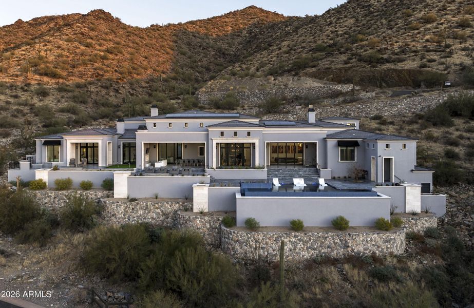 Surround yourself with the highest level of luxury in this recently completed home in the Summit at Silverleaf. A Modern Formal Mediterranean estate with the highest quality features and finishes including; 7 foot tall book matched quartzite kitchen backsplash, soaring 21 foot ceilings in the kitchen, great room, dining room and office. The 4 car garage has 12 ft ceilings, ready to install lifts to double the capacity. The back yard beckons with an infinity pool, raised hot tub, see through fireplace, putting green and amazing gas fire features. Enjoy all of this with unparalleled views of the McDowell Mountains and city lights. This sanctuary includes sustainable features such as solar panels, spray foam insulation and high efficiency windows/doors as well as the lates Control4 smart home automation. Silverleaf, located in North Scottsdale, Arizona, is a prestigious guard gated community known for its luxurious estates, exclusive golf courses, private Club and stunning desert landscapes.