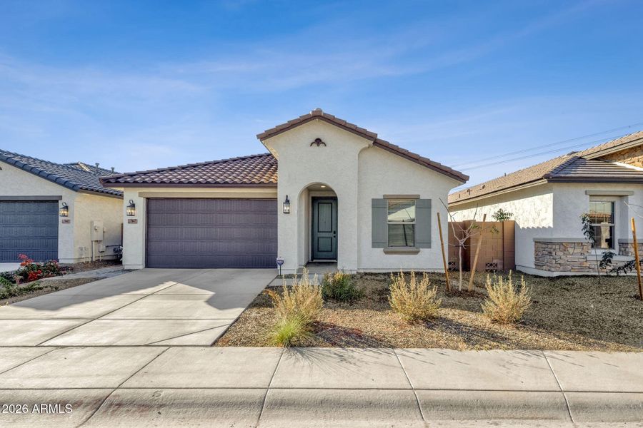 New construction built in 2025, offering the advantages of modern design and efficiency without the added expense or delay of post-build upgrades. This single-story home spans 2,082 sq ft and features 5 bedrooms, 3 bathrooms, and a 2-car garage, all arranged in a functional split floor plan designed for everyday living and long-term flexibility. This home combines new-build simplicity with immediate availability. The home features a spacious great room with vaulted ceilings, creating an open and airy living space that flows seamlessly into the vaulted kitchen and dining area. The kitchen is finished with white shaker-style cabinetry, quartz countertops, subway tile backsplash, and stainless-steel appliances, including a gas range. A large center island with seating anchors the space, while pendant lighting, a pantry, and abundant counter space support both everyday use and entertaining. The adjacent dining area flows naturally into the living space, reinforcing the open-concept design. The backyard offers a clean, low-maintenance outdoor space with a covered patio featuring a ceiling fan for shaded seating and everyday use. Artificial turf creates a finished lawn area bordered by block fencing for privacy, with decorative gravel and young plantings along the perimeter. The layout provides open sightlines and usable space for relaxing, outdoor seating, or casual entertaining, with direct access from the main living area and room to personalize over time. Conveniently located near outdoor recreation, shopping, and freeway access, with Cesar Chavez Park 1.4 miles, Laveen Village Center 2.1 miles, and Loop 202 South Mountain Freeway 3.0 miles, providing easy connectivity throughout the Valley.