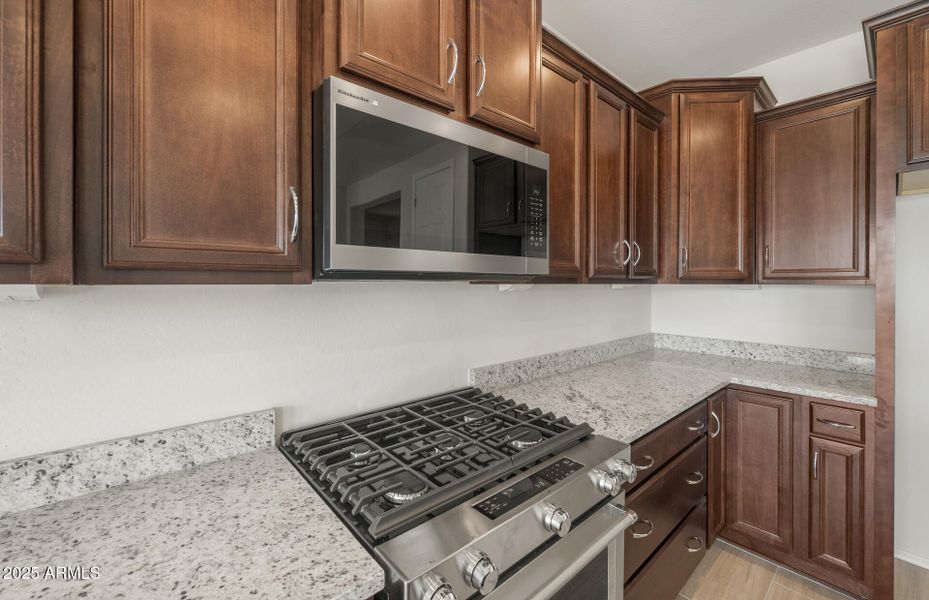 Charming 2-bedroom, 2-bath home packed with upgrades. Features include a stylish paver driveway and walkway, extended covered patio with side enclosure, stunning accent ceiling, and 8' interior doors for a spacious feel. The kitchen is a chef's dream with a gas KitchenAid upgraded range/oven, built-in microwave, and premium cabinets, countertops, and surrounds. Enjoy the convenience of the gas stub & outlet package and beautiful upgraded flooring throughout. Estimated move-in ready by July—don't miss out.
