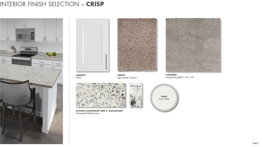 The open floorplan with a kitchen and a great room of the Sawyer is perfect for entertaining friends. White cabinets with hardware, cream/black granite countertops, travertine-look tile flooring and warm grey carpet in our Crisp package.