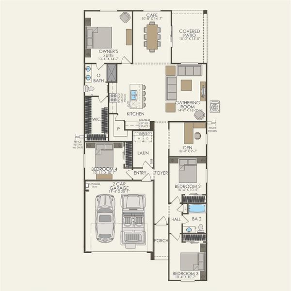 This inviting single-story Lavender floor plan features 4 bedrooms and 2 baths, plus a 2-car garage. The open-concept layout showcases a spacious kitchen with a large island—which flows into the gathering room—and a covered patio ideal for entertaining. The owner's suite is conveniently located off the gathering room and includes a generous walk-in closet. Upgraded finishes include granite countertops, stainless-steel appliances, washer/dryer, and blinds, offering both convenience and style.