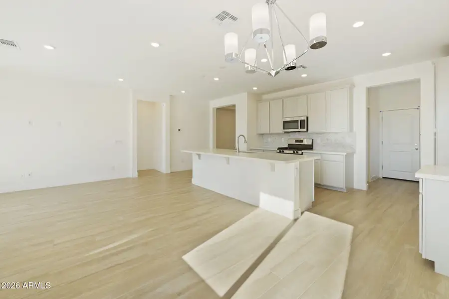 The open floor plan is accentuated by durable, extended ceramic tile flooring in a stylish wood plank design, guiding you toward a beautifully designed kitchen. This culinary haven features premium painted 42-inch Harbor cabinets with elegant crown molding, a convenient trash pullout, and a tiled backsplash. Anchoring the space is an oversized quartz center island with a single-bowl undermount sink, complemented by top-tier stainless steel appliances, including a gas range. The kitchen is perfectly poised for entertaining, with pre-wiring installed for chic pendant lights.