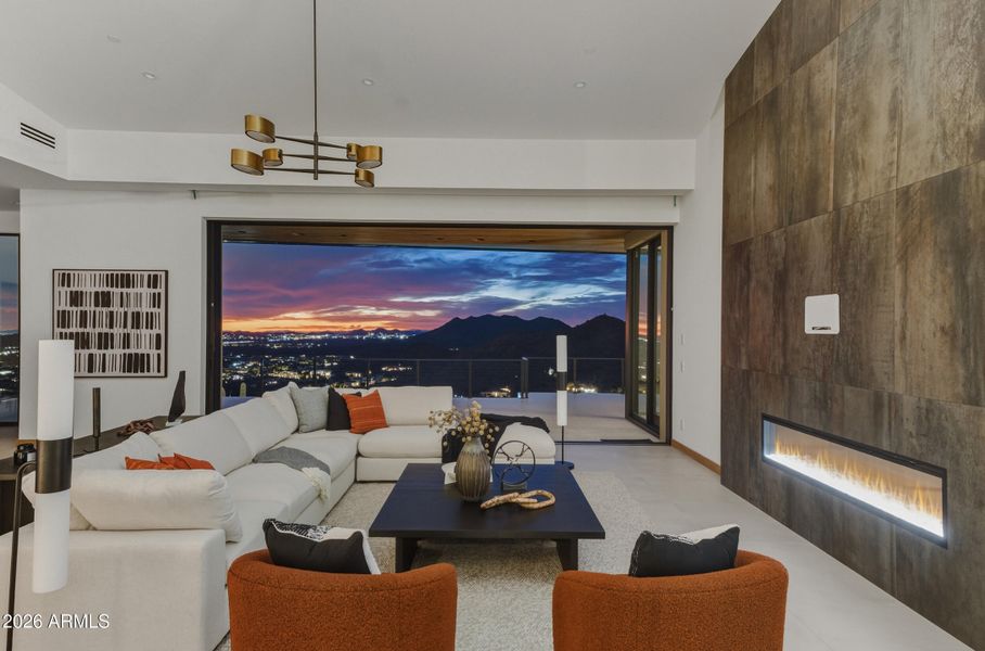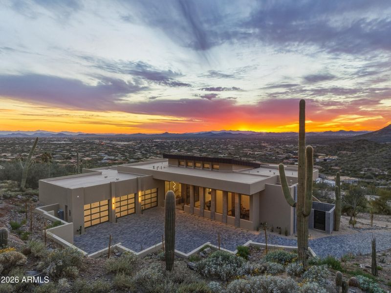 VIEWS. VIEWS. VIEWS. Perched atop Black Mountain this 5 bed 7 bath custom estate delivers some of the best 180° views Cave Creek has ever seen stretching from Camelback Mountain and downtown Phoenix to South Mountain and Cardinals Stadium. Enjoy sunsets and city lights from one of the highest elevations in the area. Floor to ceiling glass and expansive windows pull panoramic views into every room. Now fully completed the home showcases premium finishes and custom cabinetry. Amenities include a bar wine room game and bonus room private gym and a theater room/golf simulator. The heated pool and spa overlook unmatched panoramas. Set on a hillside lot with no HOA and low maintenance landscaping this one of a kind top of its class modern retreat pairs striking architecture with iconic views.