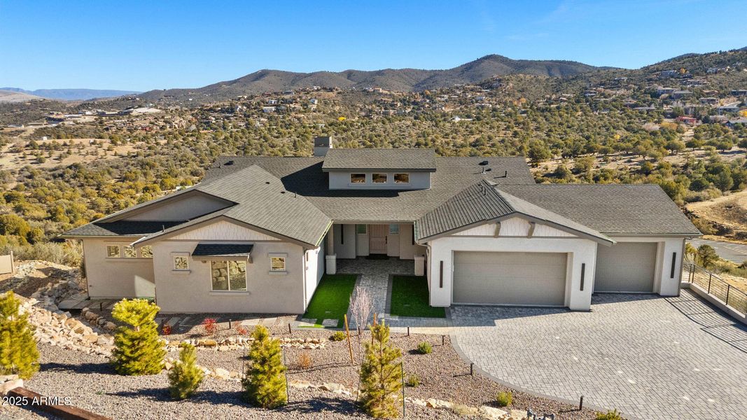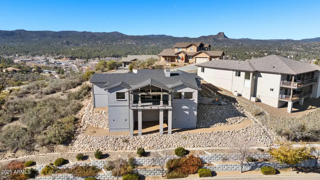 Absolutely stunning and truly one-of-a-kind, perched just above iconic Mount Vernon Avenue, this exceptional custom residence offers a rare combination of privacy, design, and breathtaking panoramic views of the Granite Dells and San Francisco Peaks—all while being moments from the heart of downtown Prescott and ponderosa pine forest nearby. Thoughtfully designed for luxury living and seamless entertaining, the open-concept floorplan welcomes you with soaring ceilings, a striking stone fireplace, and expansive windows that frame the dramatic landscape. The chef-inspired kitchen features Café appliances, a massive center island, under-cabinet lighting, elegant tilework, a vegetable crisper, double dishwasher andrefined finishes that elevate every detail.