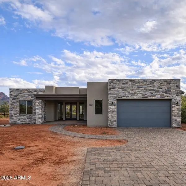 4.99% 30-year financing available for qualified buyers. Nearly complete 2025 new build on a quiet cul-de-sac with red rock views. This 3-bedroom home features an open great room with fireplace, 12' sliding glass doors, and covered paver patio. The kitchen includes a large island, quartz counters, stainless appliances, pantry, and breakfast area. The primary suite offers a freestanding tub, tiled shower, and walk-in closet. Premium finishes throughout—porcelain tile floors, matte black fixtures, and designer lighting. Includes oversized garage and stone exterior accents. Enjoy golf, hiking, and Sedona dining minutes away.