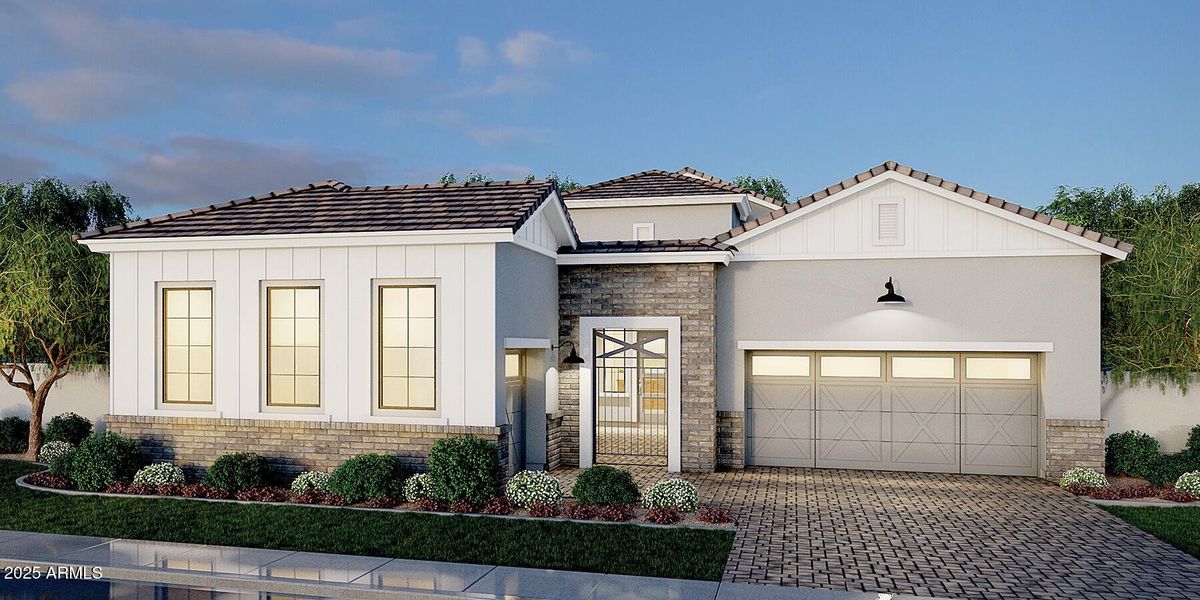 Located on Model Row with Open Space Behind you! Almost Completed beautiful quick move in home! This Incredible home sits on one of our special lots located on model row with view fencing and a nice landscaping break behind you. Featuring 12 Ft Ceilings on this single level home is a showstopper, Private front courtyard, Nice 3 car Garage split, Oversized extended covered patio, wood look flooring throughout, Quartz, Upgraded kitchen with gourmet chef's appliances Completed with design upgrades and stunning finishes. Even the garages are 12Ft ceilings bring your toys and car lifts!