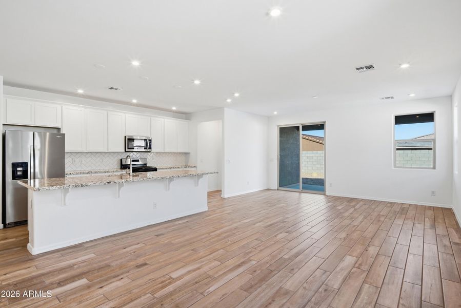 Welcome to our beautiful Shiloh home, a single-family home located in the heart of Estrella Mountain Ranch. This stunning new construction home features 4 beds, 2.5 baths, offering ample space for comfortable living. The 1930 sq ft layout includes an open great room, a modern kitchen with SS appliances including a refrigerator, granite counters, and 42'' upper cabinets. The primary suite is spacious, with a separate tub and shower in the bath, while the additional bedrooms provide plenty of room for family or guests. Additional highlights include plank style tile throughout, 2 panel 8' interior doors, and tile backsplash in the kitchen. Step outside to enjoy the views of the Estrella Mountains, perfect for entertaining or relaxing.