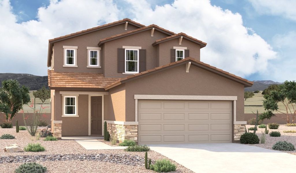 Discover this dynamic Palm home, ready for quick move-in! Included features: a covered front porch; a bedroom and full bath off the entry; a thoughtfully designed kitchen offering an island, a built-in pantry, and an adjacent nook; a spacious great room; a versatile loft; a stunning primary suite showcasing a roomy walk-in closet and a private bath; two additional bedrooms with a shared hall bath; an upstairs laundry; and a charming covered patio. This home also boasts 7" x 22" ceramic tile flooring in select rooms and quartz countertops throughout. Tour today!