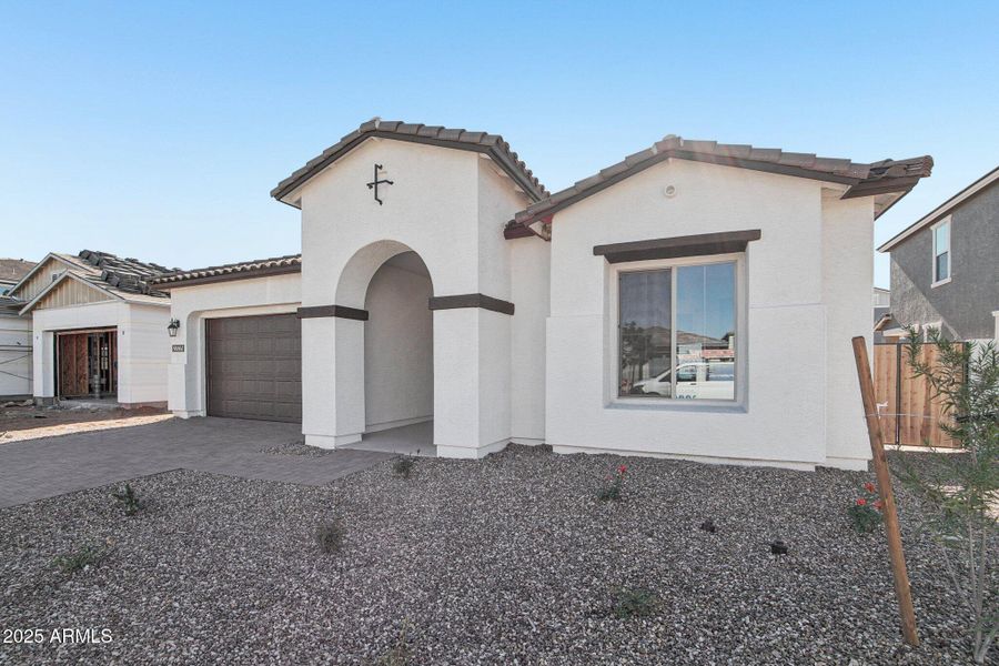Modern and bright, this single-story 2,702 sq ft Topaz Spanish home offers clean lines, natural light, and a spacious open layout. The great room features a four-panel sliding glass door that opens to the backyard, flowing into a warm contemporary kitchen with dark cabinetry, Carrara Breeze quartz, GE Profile appliances, and a large butler's pantry. A versatile teen/flex room adds extra living space. The primary suite includes a freestanding tub, enlarged tiled shower, dual vanities, and a closet-to-laundry pass-through. Wood-look tile throughout main areas, 8' doors, tankless water heater, EV outlet, and a large lot with double gate. Community amenities include a heated pool, spa, pickleball, parks, and walking paths.