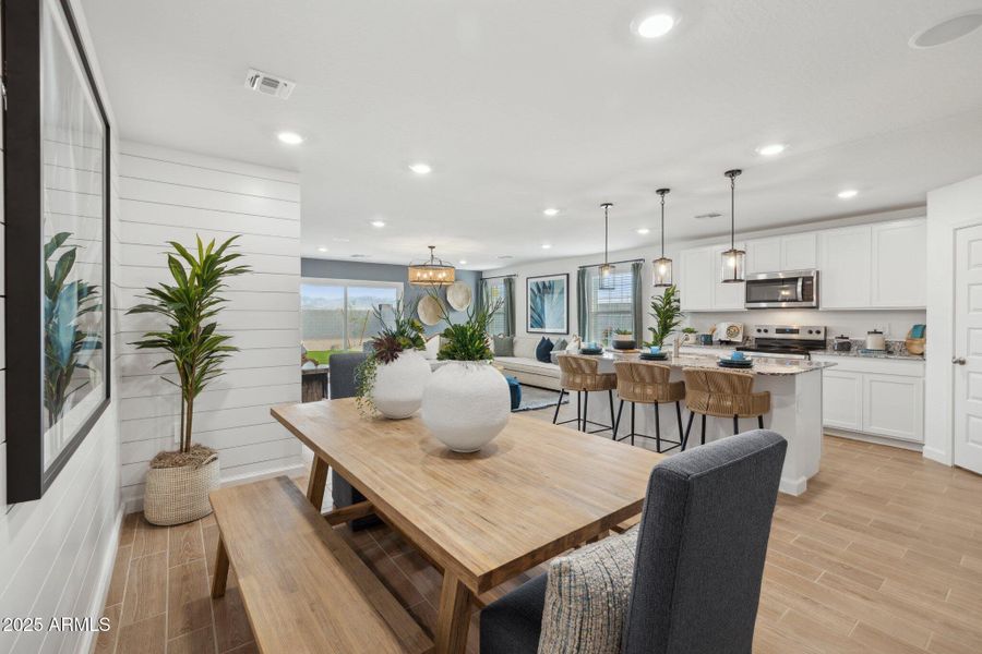 Spacious 5 BR, 3 Bath Home on Expansive 8500+ SF Lot! Welcome to this beautifully designed 5 br, 3 ba home that perfectly balances comfort & style. An open concept kit flows effortlessly into the expansive great room, creating an ideal setting for modern living & entertaining. The kitchen showcases timeless white shaker style cabinetry, granite countertops, & S/S appliances, offering both elegance & practicality. Durable 6x24 '' wood look plank tile enhances the main living areas, while plush upgraded carpet provides comfort in each Br. The thoughtful layout includes a versatile 5th br, w/double doors, ideal as a home office, guest suite or media room. Step outside to a covered patio overlooking the impressive 8400+ SF lot-a rare opp to create the backyard retreat Pics are of model home