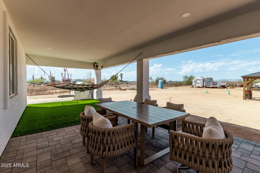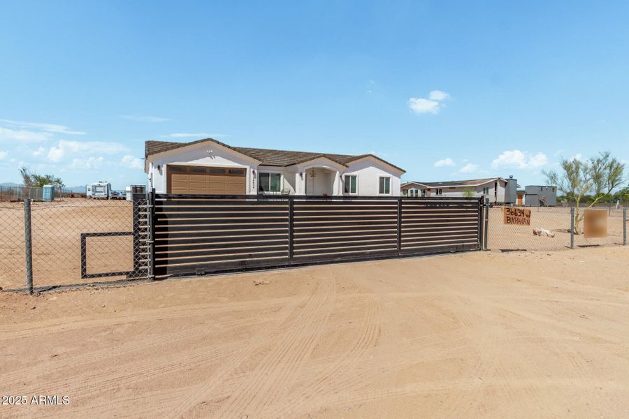 Highly upgraded custom home was just recently completed with 4 beds/2 baths over 2000 SF house with 1187 SF massive covered patio. 1.25 acres fully enclosed and ready for you with limitless options. Extended 2 car garage with epoxy plus a welcoming front porch. Generous great room w/wood-look tile flooring throughout the entire home. Gourmet chef's kitchen is equipped w/ample double stacked cabinetry, pantry, quartz counters, custom tiled backsplash, SS appliances, pendant lighting, and lg island w/breakfast bar. You'll love the primary bedroom, showcasing a walk-in closet and a private ensuite w/dual sinks and custom tiled shower. Large covered patio with pavers, turf and misters is perfect for entertaining year round! This property will not disappoint in person and is a must see!