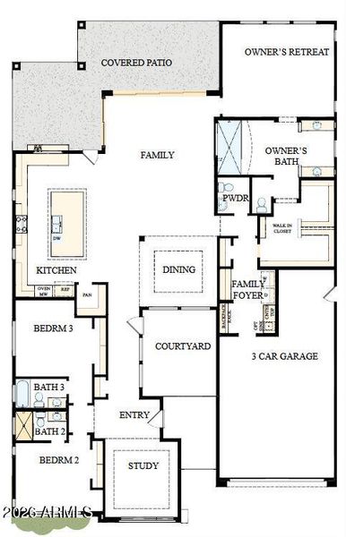 BRAND NEW single level home with 3 ensuite bedrooms, 3.5 baths, study, courtyard, dining area and 3 car garage; clean white cabinets with dark countertops, GE stainless appliances, HUGE center island, 16' sliding glass door and 8' sliding glass door exiting family room out to extended covered living area; utility room upper and lower cabinets with utility sink; 2-tone paint, upgraded plank tile, carpet and pad throughout; 2x6 construction and extensive new home warranty; see you soon!