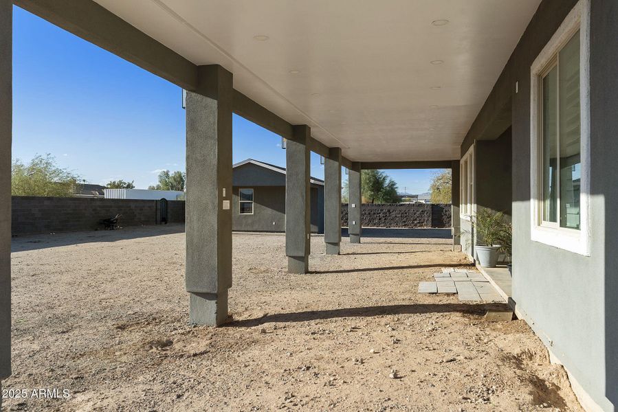 The chef's kitchen is equipped with stainless steel appliances including the refrigerator, quartz countertops, and a large center island. Additional features include a washer and dryer, a split floor plan, a three-car garage with an attached RV garage, two RV gates, and a fully enclosed block fence. A separate workshop offers versatility for hobbies, storage, or can easily be converted into a casita. The expansive backyard is a blank canvas, waiting to be landscaped and personalized.