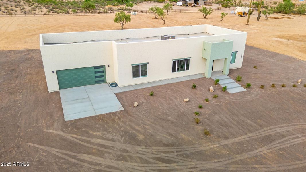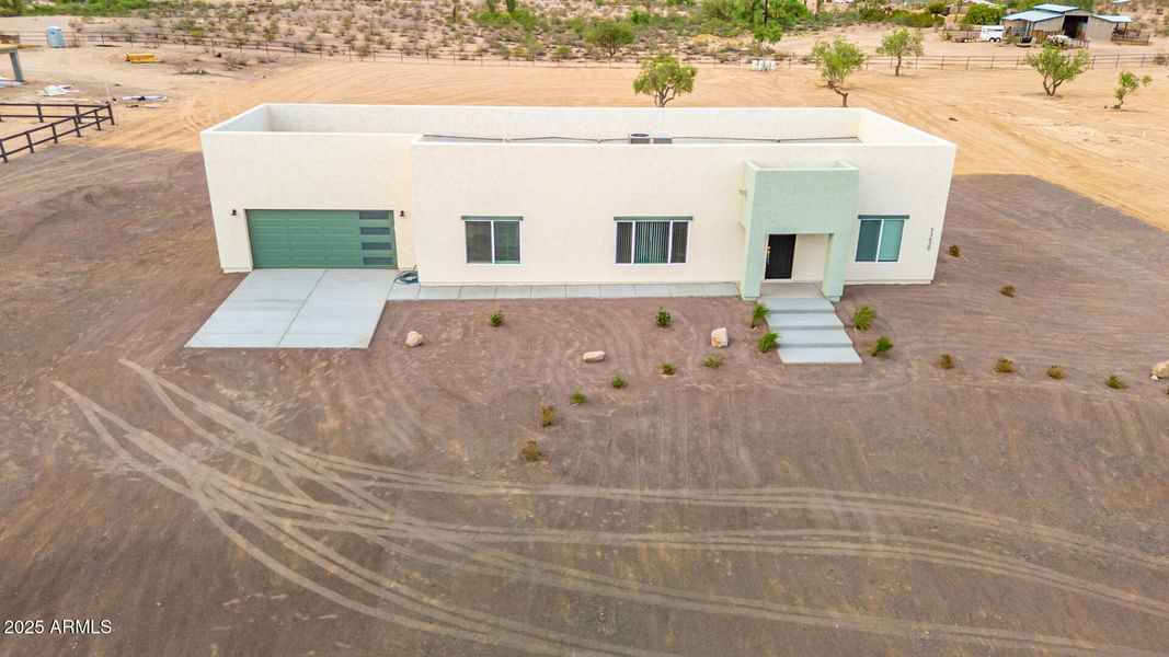 Become the proud owner of this beautiful new construction on a sprawling 1.4-acre horse property! Private streets lead you to a lovely 3-bedroom, 2-bath home with a 2-car garage and an inviting front patio. You'll be delighted by a captivating open layout with a soothing palette, recessed lighting, blinds, and sleek tile flooring. The gourmet kitchen boasts quartz counters, abundant wood cabinetry with crown moulding, stainless steel appliances, a pantry, and an island with a breakfast bar for casual meals. The primary bedroom showcases a walk-in closet and a private bathroom for added comfort. Enjoy enchanting sunsets in the expansive backyard, which offers a covered patio and abundant space for crafting your dream outdoor oasis or establishing equestrian facilities. Don't miss this gem!