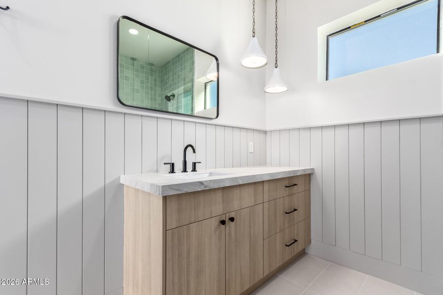 Modern luxury meets everyday comfort in this brand new 6-bedroom, 5.5-bath Scottsdale estate with a 4-car garage. Soaring 12-foot ceilings and dramatic vaulted living spaces create an open, airy atmosphere filled with natural light. The chef's kitchen features double islands, sleek cabinetry, quartz countertops, and premium appliances, perfect for entertaining or family gatherings. Massive sliding doors seamlessly extend the living space outdoors to a private resort-style backyard with sparkling pool, spa, built-in BBQ, and gas fireplace. The home offers a true split floorplan, providing privacy between the primary suite and secondary bedrooms. The primary suite is a serene retreat with an oversized walk-in shower, dual vanities, and a spacious walk-in closet.