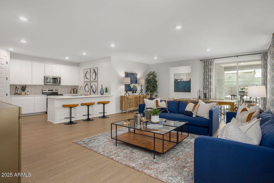 This beautiful, single-story home showcases an open floor plan . Modern tile flooring extends through the common areas, while plush carpet adds warmth to the bedrooms. The kitchen includes a large breakfast bar and stainless steel appliances. An open den easily adapts to your needs, whether as a home office or a space for family fun. The primary suite offers an oversized closet and an en suite bath with a dual-sink vanity and 42-in. garden tub/shower combination. Additional highlights include a dedicated laundry room, WaterSense®-labeled faucets, energy-efficient low-E windows and smart thermostats for added comfort and control.