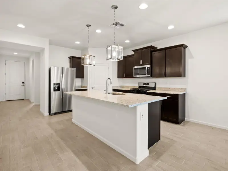 The Topaz Floorplan offers a teen room that makes the perfect additional living area. Umber cabinets with shaded grey granite countertops, wood-look tile flooring with multi-tone carpet in our Elemental package.