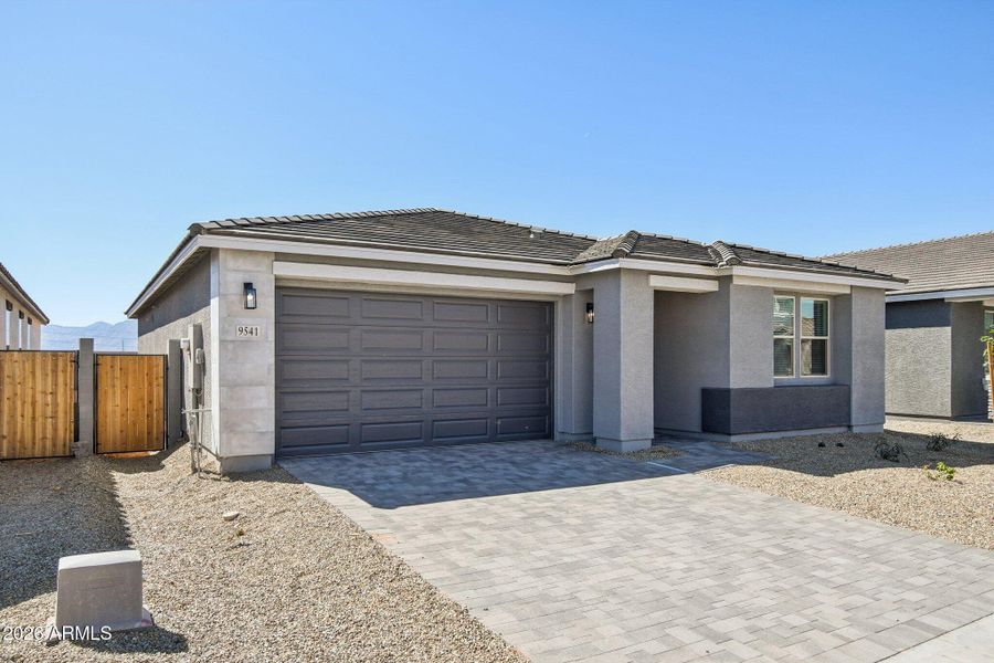 This bright and open single story home offers 1,579 sq ft of well-designed living space. Walk up to your charming new home featuring a Modern exterior with a pavered driveway and entry. It features 3 bedrooms, 2 bathrooms, and a 2-car garage. The open concept kitchen is perfect for entertaining and features a large Island for meal prep, walk-in pantry and stainless steel appliances with range, microwave, dishwasher and refrigerator. It also offers our Foundry Collection which includes 42'' gray cabinets, Black Bronze hardware, dark quartz kitchen countertops, beautiful boho 500 Cinder 3x10 brick offset style tile kitchen backsplash, and wood looking plank tile in all the common areas. A washer, dryer, soft water loop, upgraded 8' interior doors, and 2'' faux wood blinds are also included. The great room offers a 4-panel center sliding glass door so you can step out into your covered patio to enjoy indoor/outdoor living in your backyard with friends and family. Great location close to dining, freeways, parks, and entertainment!