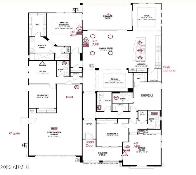 Single-Level Home with Private In-Law Suite - 3,262 SF - April Completion! Rare opportunity for a spacious multi-generational floorplan featuring an In-Law Suite plus 3 additional bedrooms, a large study, 4 baths, and a 3-car garage. The private suite includes its own living room with kitchenette, large bedroom, bathroom with shower, and two closets--perfect for extended family or long-term guests. Inside, you'll find 10' ceilings throughout and a wide, welcoming hallway leading to a large dining area and bright open Great Room ideal for entertaining. The Gourmet Kitchen features a 36'' cooktop with separate built-in oven and microwave, quartz countertops, designer tile backsplash, under-cabinet lighting, and pendant light pre-wires. A dramatic 16' Atrium sliding glass door opens the... Great Room to a spacious covered patio for seamless indoor-outdoor living. The luxurious primary bath includes dual sinks and a spa-inspired walk-in shower with dual showerheads. Additional upgrades include 8' interior doors, two-tone paint, ceiling fans, window blinds, and a gas stub for BBQ. The home also includes an EV charging outlet, Wi-Fi-enabled garage door opener, tankless water heater, and soft water loop. Other highlights include coach lighting, a paver driveway, and a front yard landscaping credit. Built for efficiency, the home is ENERGY STAR® Certified and Indoor AirPLUS rated, delivering superior energy savings and healthier indoor air. Located in a vibrant master-planned community with miles of scenic pathways and resort-style amenities including an impressive aquatic center with a large pool with splash features and a lap pool, picnic areas with BBQ grills, multiple playgrounds, basketball, sand volleyball, pickleball courts, bocce ball, ping pong, cornhole, and more.