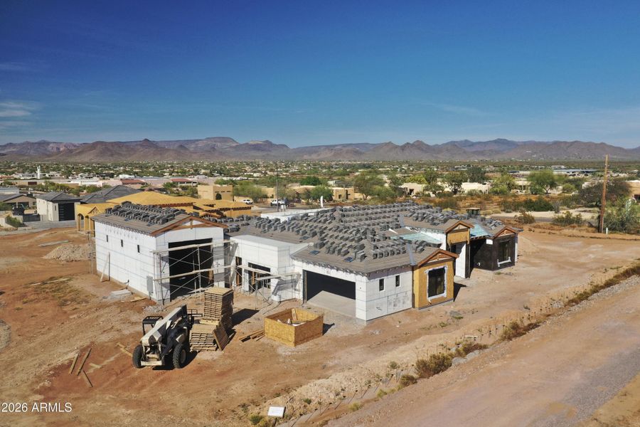 Construction is officially underway on this stunning new custom home featuring jaw-dropping finishes and an attached RV garage. Perched on an elevated 1-acre lot with full block fencing, no HOA, and breathtaking views of Cave Creek Peak and Pyramid Peak, this property truly stands apart. Inside, the gourmet kitchen impresses with upgraded appliances, upgraded cabinetry, quartz countertops, a massive center island, and a walk-in pantry complete with cabinetry and counter space. The spacious great room showcases a dramatic sliding glass wall that opens to the outdoors and a beautiful stone fireplace centerpiece. Luxury continues throughout the home with custom tile showers, wide-plank wood flooring, a freestanding soaking tub in the owner's suite, and countless designer touches.