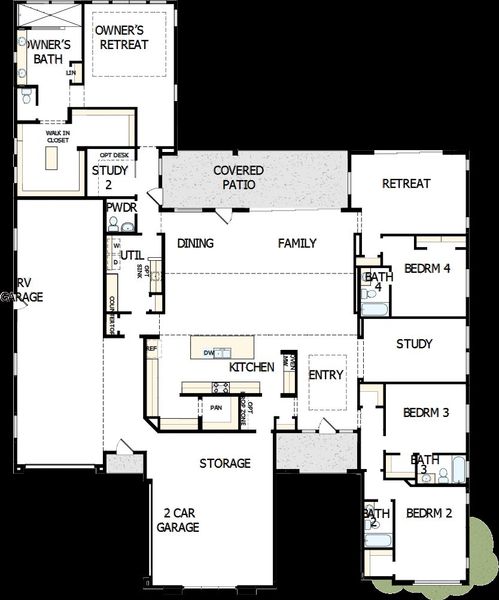 This home also includes a 2-car + RV garage, fully air-conditioned and equipped with an RV clean-out for convenience and comfort. Built with 2x6 construction and spray-foam attic insulation, it’s designed for energy efficiency and long-lasting comfort. Situated on an oversized lot of over 18,000 sq ft with four bedrooms, a retreat, and two studies, the Highpoint provides ample room for outdoor living and future customization.