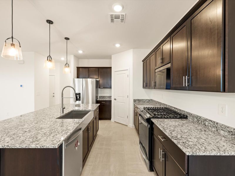Open-concept living with three bedrooms and a covered back patio. Enjoy a private primary suite with a walk-in closet. White cabinets with grey countertop and beige wood like tile flooring in the Charm package.