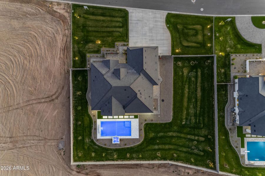 Move in ready!!! Welcome to this brand-new home in the New Cloud Creek community in the heart of Queen Creek. This luxury residence offers 5 spacious bedrooms, 3.5 beautifully finished bathrooms, and an open layout with 12' ceilings. The gourmet kitchen features quartz countertops, a large island, custom white oak full-overlay cabinets with gold accents, and high-end stainless steel appliances, including a gas Wolf stove. The main bedroom includes space for a sitting area and sliders to the patio and pool/hot tub. Enjoy large flood-irrigated lots with natural grass, plus an office/den and a home theater/bonus room.