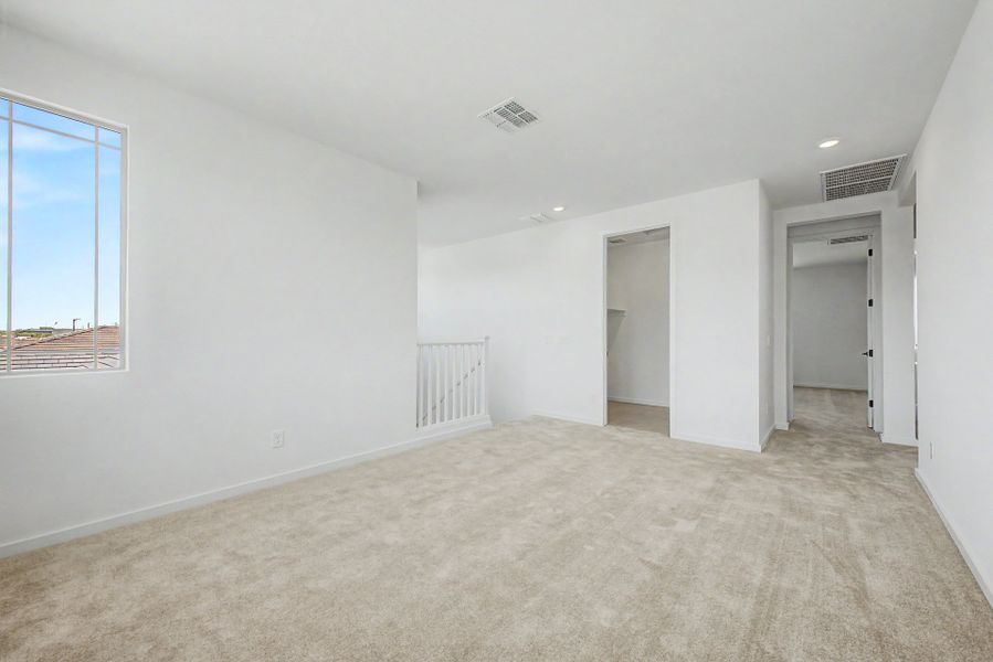 This thoughtfully designed home maximizes space with a versatile garage featuring an 8′ door and optional workspace, a spacious kitchen with a large island, breakfast bar, and oversized pantry that opens to the great room and backyard. A downstairs bedroom with walk-in closet and full bath adds flexibility, while upstairs includes a generous loft, additional storage room, and spacious bedrooms. Upgraded with 8′ doors throughout, stair railing, soft water loop pre-plumb, square sinks, and matte black hardware and fixtures. This is modern living at its finest.