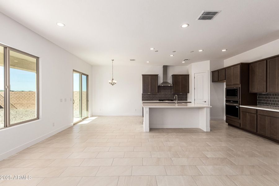 One of the most upgraded single-story homes in Lucero; modern, bright, and truly move-in ready. This Crimson plan features an open layout with clean tile floors, soft carpet in the bedrooms, and sleek brushed-nickel finishes. The kitchen shines with 42'' maple cabinets, whole-house quartz, a built-in gas cooktop, wall oven, canopy hood, large island, and stylish backsplash. Enjoy upgraded Cheyenne doors, recessed lighting, ceiling fan prewires, and a security system. The owner's bath offers porcelain surrounds and modern fixtures. A spacious, fresh home in beautiful Estrella.