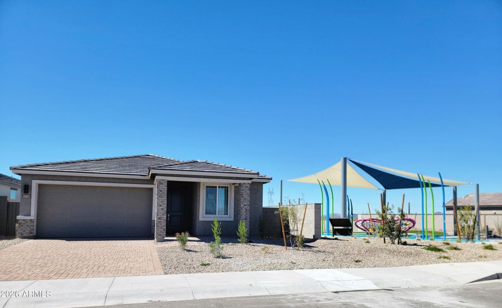 Popular Favorite with Flexible Living! It's no surprise the Leslie is one of our most popular floorplans! This well-designed 3-bedroom, 2-bath home offers a versatile layout that adapts easily to a variety of lifestyles—whether you're hosting guests, working from home, or simply enjoying everyday living in comfort and style. This home has umber cabinets with hardware, granite kitchen counter, tile flooring and carpet in the bedrooms! Amenity-rich Teravalis will have basketball, pickleball, tennis courts, parks, a resort-style swimming pool, a kid's splash pad and water features. Future residents will enjoy a clubhouse with a fitness center, gathering areas and so much more! Enjoy move-in ready homes with washer, dryer, fridge, whole home blinds included in every home.