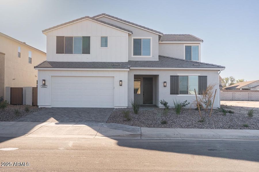 Enchanting farmhouse-style home featuring a spacious 2-story floor plan with a bedroom and bathroom with a shower downstairs, 5 total bedrooms throughout, 3 bathrooms, a flex space/office downstairs, a loft upstairs, an extended covered patio in the private backyard, an attached 3 bay tandem garage, and designer upgrades throughout! The kitchen boasts a GE Profile 36'' gas cooktop appliance package including double ovens, microwave, and a designer-style hood in stainless steel, a touch faucet, single bowl kitchen sink and pot filler, white cabinets with black granite countertops, and an extended waterfall island in blizzard granite. Other upgrades include a corner sliding glass door at the Great Room, 12'' x 24'' tile in high traffic areas, 2'' window blinds, and interior paint in Snowboun