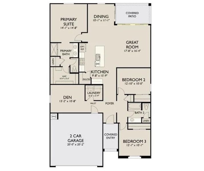 Welcome to the Marigold at Skyline! This 1,777 sq ft single-story home features 3 bedrooms, 2 bathrooms, a flexible den, and a 2-car garage with a stylish Spanish-style exterior. The Coastal Collection offers a clean, modern look with white cabinetry, quartz countertops, chrome cabinet pulls, and wood-look tile in all main areas. A 12' sliding glass door brings in natural light and opens to the backyard for seamless indoor-outdoor living. Enjoy 8' interior doors, blinds, stainless steel appliances, refrigerator, washer, dryer, and a soft water loop. Located in Skyline with amenities including a pool, splash pad, pickleball, basketball, volleyball, walking trails, fitness center, tot lots, and a community clubhouse with kitchen. Enjoy the good life!