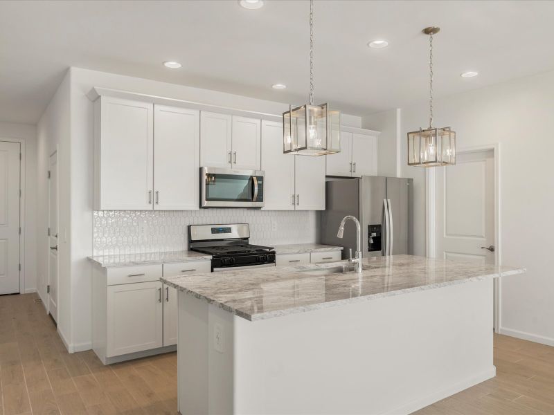 This spacious 5-bedroom plan features a downstairs guest bedroom and bathroom. Enjoy white cabinets with white quartz countertops, rectangular light beige tile flooring and cool neutral carpet in the Finesse package.