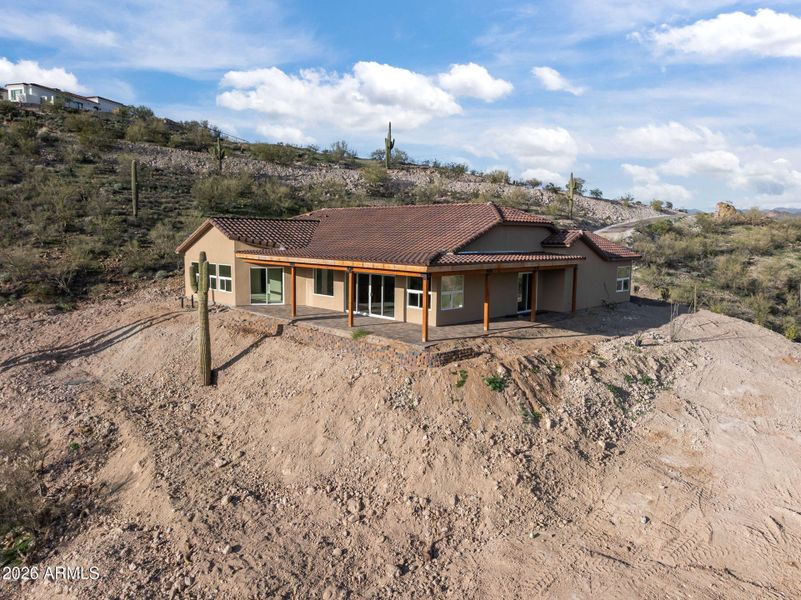 Perched on a private 4-acre hilltop, this 2025 new-build by Dahle Construction offers breathtaking panoramic views of surrounding mountains, washes, and open desert—a true Wickenburg showpiece. Thoughtfully designed and beautifully finished, this 3-bedroom, 3-bathroom home spans over 2,500 square feet, blending refined craftsmanship with modern desert living. Inside, vaulted ceilings and abundant windows flood the home with natural light while perfectly framing the remarkable views from nearly every room. Warm-toned flooring, updated modern fixtures, and impeccable attention to detail create a welcoming yet elevated atmosphere throughout. The chef's kitchen is both stunning and functional, featuring granite countertops, custom cabinetry, stainless steel appliances including a gas stove, and a spacious walk-in pantry -ideal for entertaining or everyday living. The open layout flows seamlessly into the main living areas, enhancing both comfort and connection. Retreat to the luxurious primary suite, where the spa-like bathroom impresses with elegant tile work and a beautiful soaking tub, offering the perfect place to unwind while surrounded by desert serenity. In addition, there is extensive patios, a 3-car garage and plenty of room to add a shop or RV garage! The private well and septic offer low utility bills. With privacy, views, and quality construction, this exceptional new build captures the essence of upscale desert living in Wickenburgwhere wide-open spaces, dramatic landscapes, and timeless style come together.