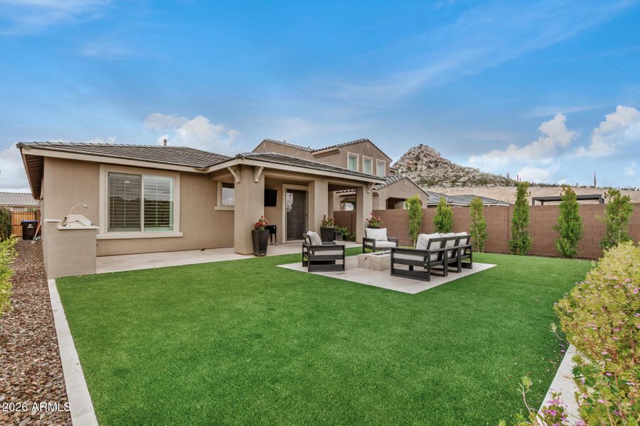 Enjoy an open, modern layout enhanced by premium finishes throughout. The professionally landscaped backyard is an entertainer's dream, complete with a custom BBQ island, expansive fire pit, wired and mounted for tv, travertine hardscape, and lush green turf—all perfectly positioned to take in unobstructed, breathtaking mountain views.