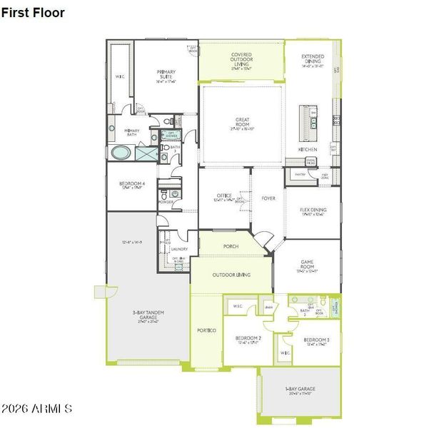 Enchanting, single-story home boasting 4 bedrooms, 3.5 bathrooms, an extended dining area, a flex dining area, an office, game room, an attached 3 bay tandem garage, an attached 1 bay side turn garage, outdoor living spaces, and designer upgrades throughout! Interior upgrades include Benton Birch Flagstone cabinets, Della Terra Carrara Breeze Quartz kitchen countertops. a multi panel sliding glass door, 12' ceilings in the Great Room, a tile tub and shower surrounds in the primary bathroom, interior paint in Snowbound, 2 panel interior doors with satin nickel hardware, window blinds, carpet at the bedrooms, and tile flooring everywhere else. The exterior of the home boasts pavers at the front porch, a gas stub at the covered back patio, and a 8' gate ILO std. Soft water loop included.