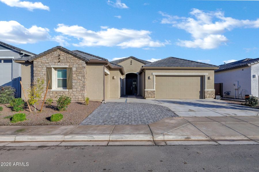 ATTACHED CASITA / NEXTGEN LIVING - This newly built home offers 3,025 square feet of flexible living space and a private attached casita with its own entrance and backyard access. The main home features 3 bedrooms, 2 full bathrooms, and a dedicated office space all designed around an open, light-filled floor plan. Wood-look tile flooring, recessed lighting, and oversized sliding glass doors with electric shades create a seamless flow between indoor and outdoor living. At the heart of the home is a chef's kitchen built to impress, anchored by a professional 8-burner gas range with split oven, stainless steel hood, quartz countertops, custom cabinetry, a large center island, wine fridge, and premium stainless steel appliances. The primary suite offers a spacious retreat with a modern en-suite bathroom featuring dual vanities, a large walk-in shower, and generous closet space. Step outside to a low-maintenance backyard with paver patio and artificial turf perfect for relaxing, entertaining, or enjoying Arizona evenings without the upkeep. The attached casita offers a full kitchen, living space, bedroom, full bathroom, and laundry. A perfect fit for buyers seeking space, functionality, and high-end finishes all on a single level. Wales Ranch is a gorgeous new build community that offers pickleball courts, basketball courts, a lake, and many other accommodations!